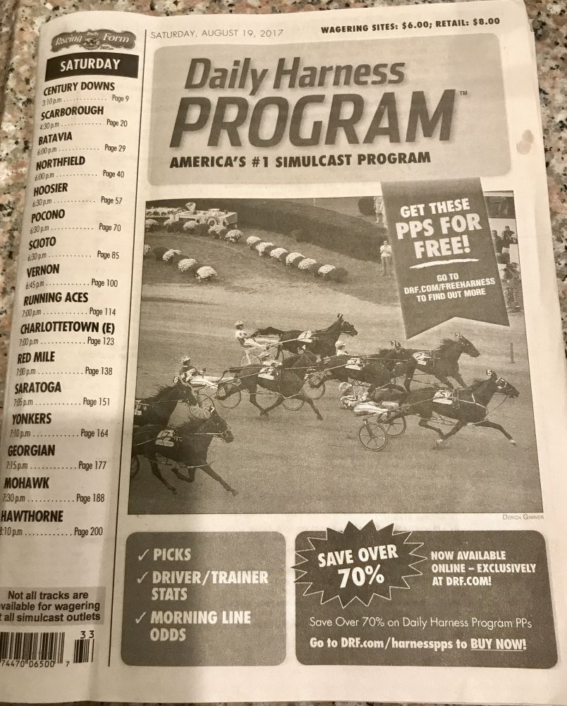 我们随他进入俱乐部,在一个有电视的餐桌坐下,他给每人点了酒,又要了头台,路易开始给我们上课。首先他买了两本手册。告诉我们如何根据以往的成绩来判断今天马的状况,还有骑手的状态也要考虑。他最喜欢在滨州的一个赛马场,是那种马拉车的比赛。从晚上6点半到11点一共14个比赛,每场比赛都要判断哪个马可以跑第一,哪几个马跑的一二三的顺序,或者不分顺序,只要在前后脚就行。总之花样不少,2美金就可以买一张马票。我们跟着他选就好了,老路易压力不小,吃喝都不重要了。认真研究有一次他猜中了三个马的顺序,不幸的是报了个冷门,一匹名不见经传的马竟然跑了第一名,据路易讲我们错失了3千美金的大奖。
