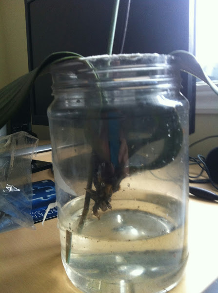 1.奄奄一息,根都剪掉了,叶子没剪便于挂在瓶子边上。