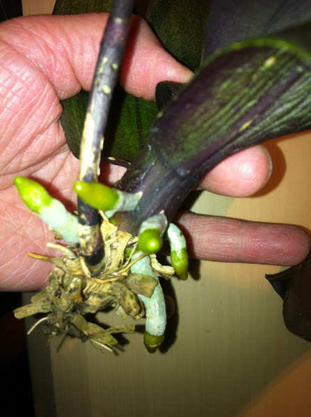 我把光秃秃的兰花架在一个大的花生酱空瓶,找了一个透明塑料袋套着,放在朝西的窗台,抱着死马当活马医的心态。每星期把秃秃的根放水里沾一下打湿然后悬空。过了大约1个半月发现有1毫米的新根和新叶出来了,高兴得四处宣扬。又过了两个月,长出7条新根和两片新叶,神奇的是花杆上又长出了根和叶,一变为二了。 我把老叶全部剪掉,当根长到5厘米长时种到木屑里,再按常规浇水施肥,希望明年能开花。等杆上的小苗再长大一点我就把它剪下来另外分盆种植。