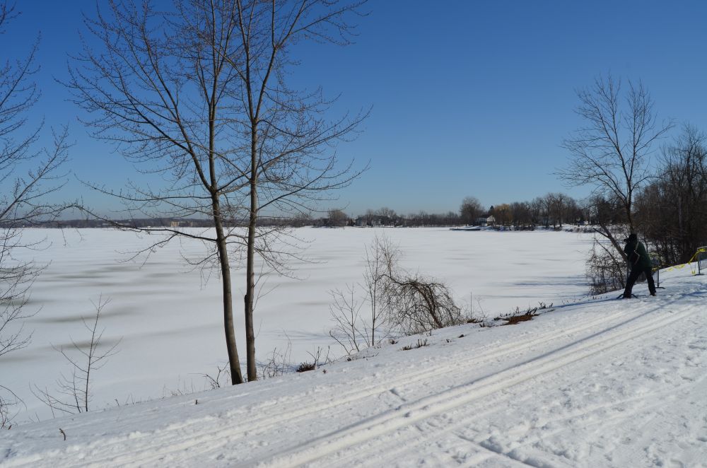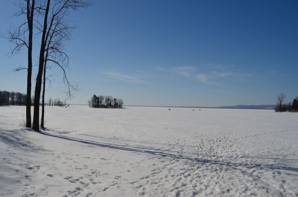 这里夏天是沙滩,冬天湖面结冰,有人在远处冰钓。