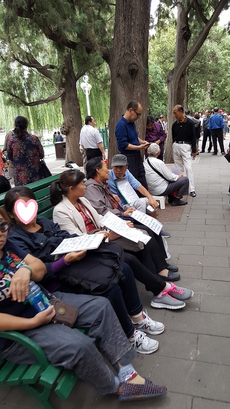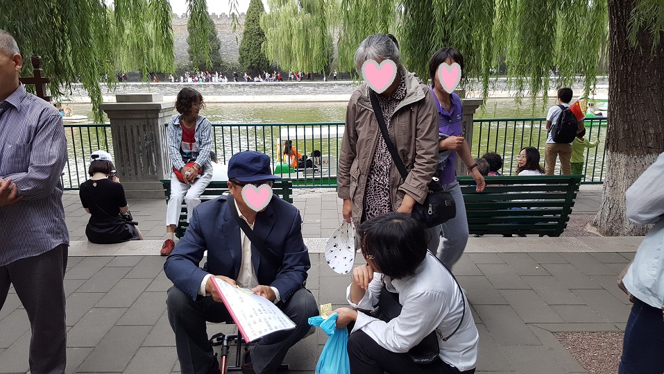不得不说,这样排排坐、一人一摊位,供人打量的感觉真像是个做交易的市场,所有的价钱都尽在不言中,等待有缘人开眼。特别是有些家长已经白发苍苍了,疲惫地坐在自带的小凳上,透着一丝愁苦。他们的孩子一般年龄都偏大,七零后的也有,离婚的也有。有位知识分子模样的老先生,戴着深度近视镜,坐在小凳上,给三十八岁的女儿征婚。他旁边蹲着两位正在跟他交流信息的男女,老人颤巍巍地拿出写得密密麻麻纸页泛黄的笔记本,着急地翻找着,好像生怕慢一点人家会不耐烦起身走掉。看上去真是有点心酸。