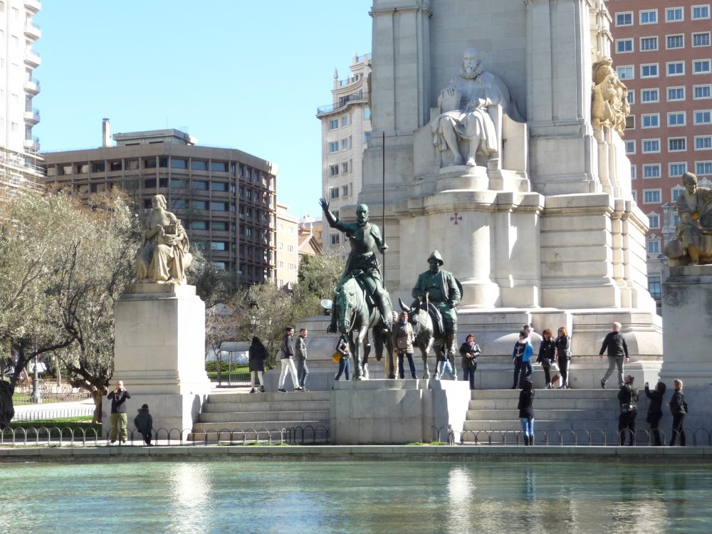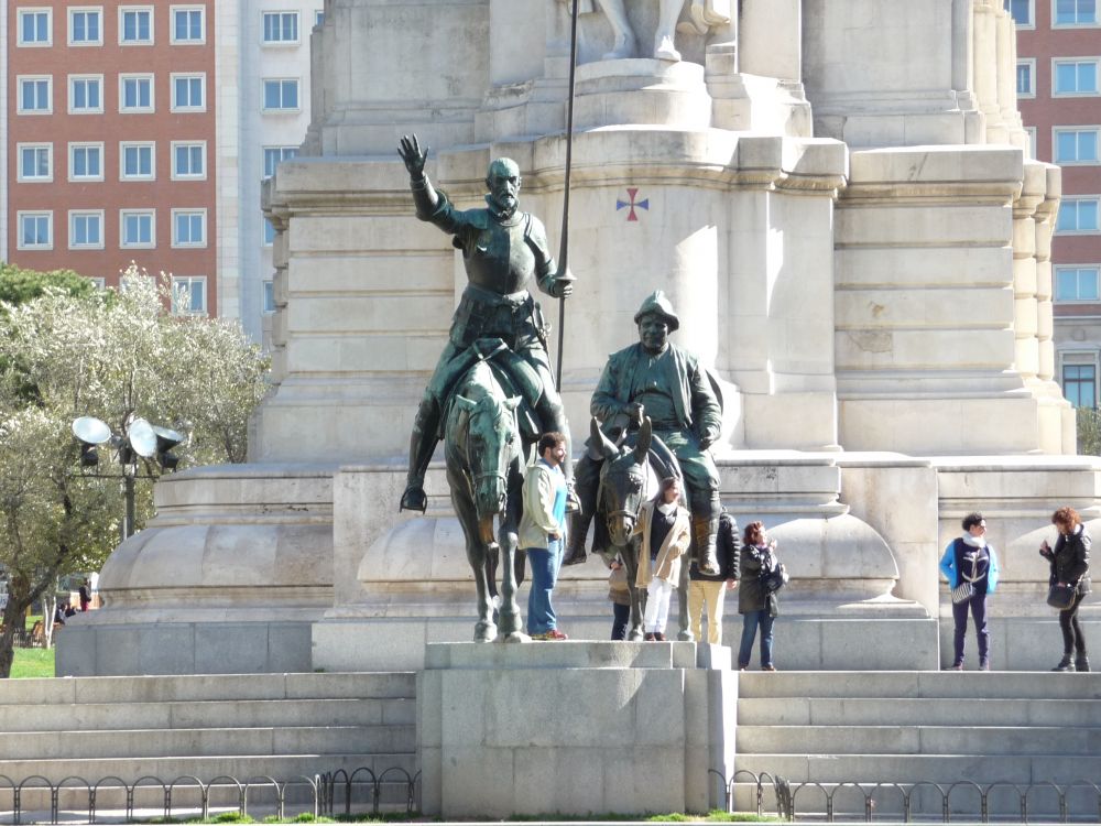 马德里,从机场直接就去了西班牙广场,中心就是塞万提斯的雕像,老人家高高在上地看顾着他创造出来的唐-吉柯德和桑丘-潘扎。这两哥们骑的马和驴子有点像像华尔街附近的铜牛一样,人们偏爱它们的屁股和鼻子,老在那抠摸指望能倒腾些什么出来,结果大老远就能看那器官特别亮。幸亏它们脾气好,不撂蹄子也没打喷嚏。