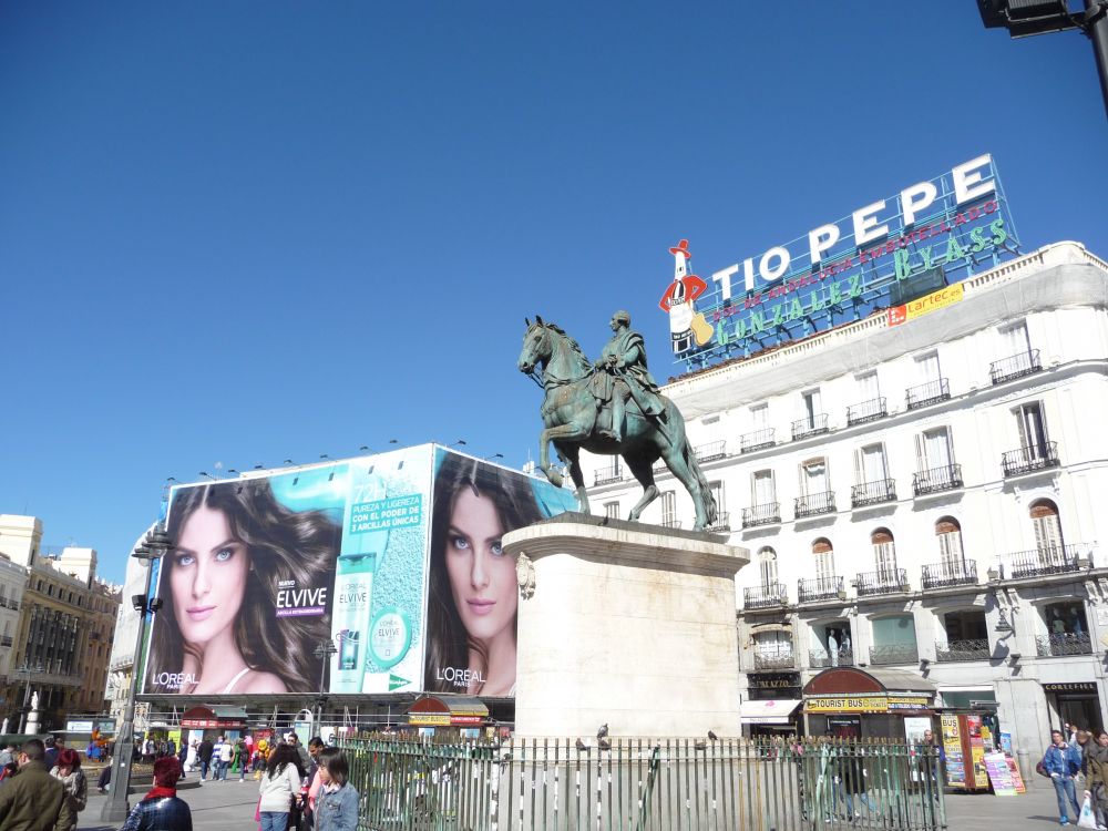 马德里太阳广场,古老的骑士雕像和时髦的护肤品广告和谐相处。