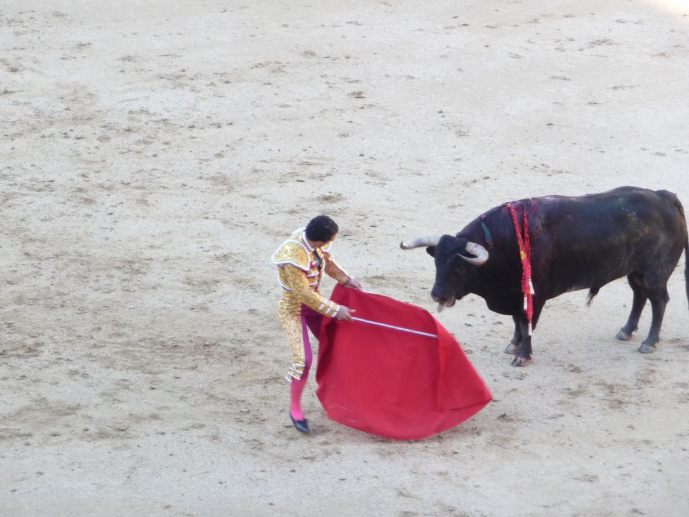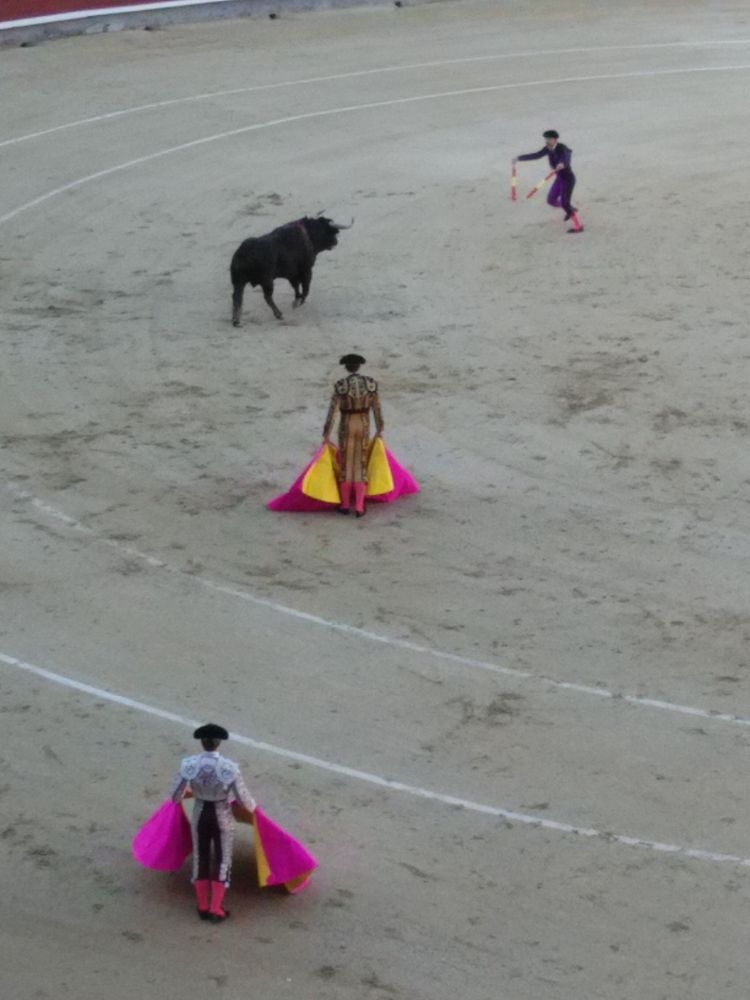 花45欧元买张黄牛票去看人用愉快和狂热逗弄六条牛,然后用讲究的剑法一剑让它们倒下。平均20分钟送一条牛去免除痛苦。我看到第三条牛倒下后就离开周围喝着汽水在欢呼雀跃的人群了。现场并不太血腥。朋友问不杀不行吗,我想想,不杀还真不行,缺了个高潮。斗牛最后那一剑和足球临门那一脚的魅力是一样的。