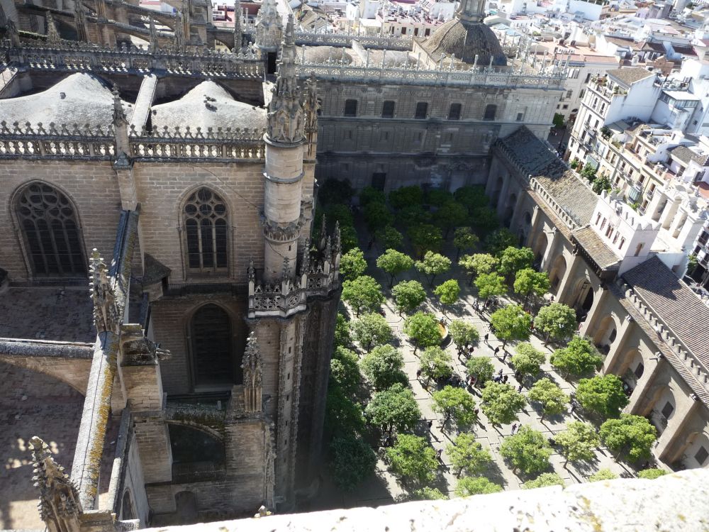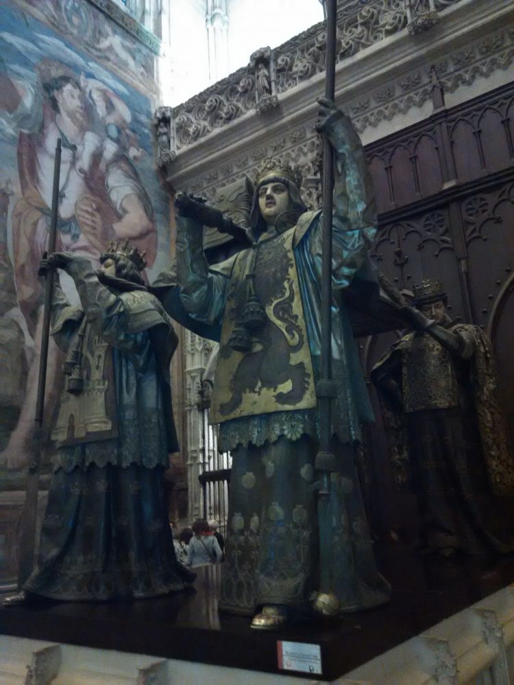 塞维亚大教堂据说是世界上最大的的哥特式教堂。教堂里的荣归故里的哥伦布的铜棺由四个西班牙公国的国王抬着。王者只配给国家英雄抬棺,这就是人们对历史的认可。一个意大利的热那亚人拿西班牙女王的钱,以神的荣耀的名义,开拓了一片借欧洲文明延展的大陆,最后的遗骨在几度迁移后最终回到他开始扬帆驶向生死荣辱叵测的探索的地方。