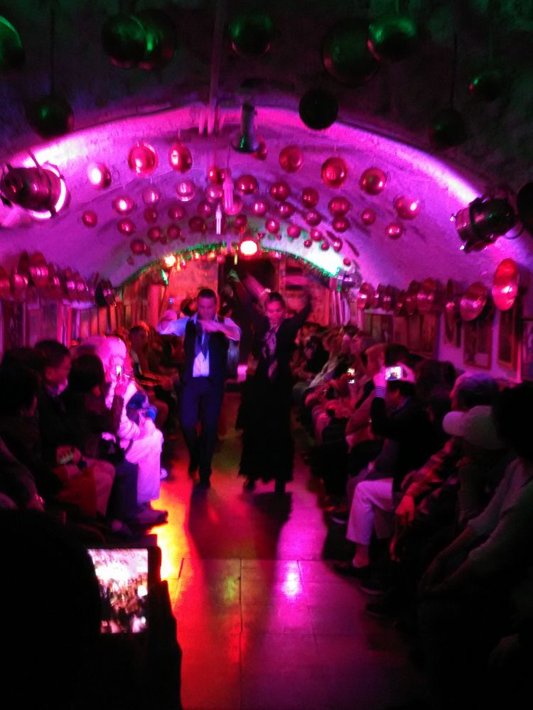 夜里,我们被带去吉普赛人挖出的“穴居”中去看原汁的弗拉明戈舞。很局促的空间,洞顶还挂不少手工打的铜锅做饰品,墙上有西班牙国王一家,奥巴马太太光临大照。