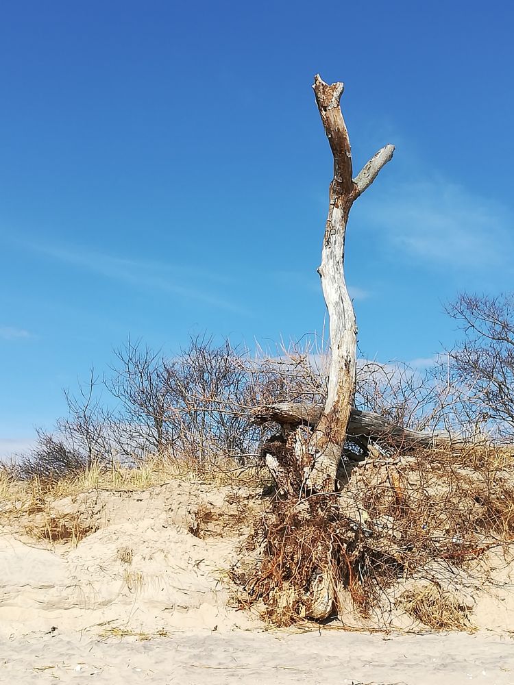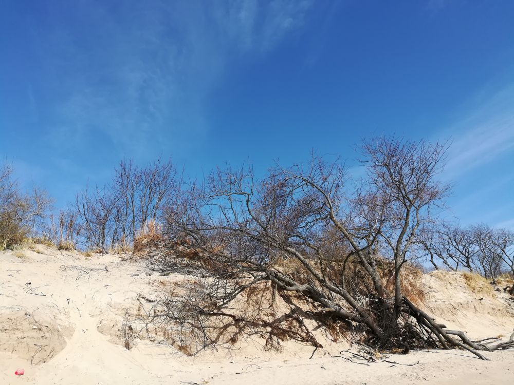 摄氏六度,沙滩上,那哥们用风筝做动力来踩浪行(图1,2)。一开始看他躺水里,我倒冷得打起哆嗦来。还是自己带着脚印去看阳光,沙滩,海浪,...。天空蓝得让人心悸,没有“枯藤老树昏鸦。。。。古道西风瘦马”却有枯树,归雁,沙鸥,春风,流云,朗日。此时纵有天问,毋宁留作静思。