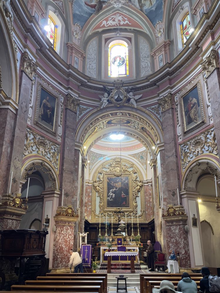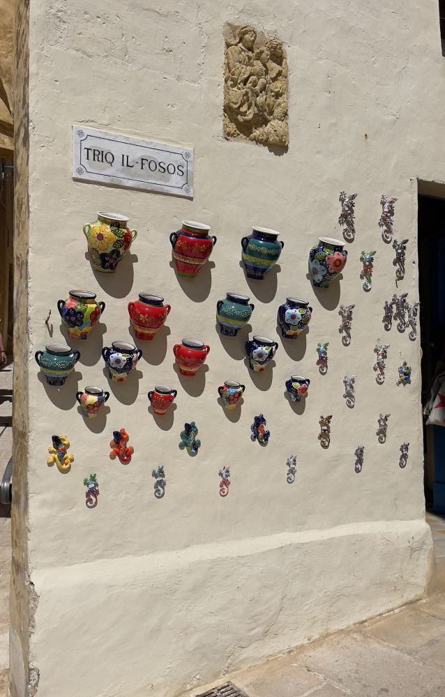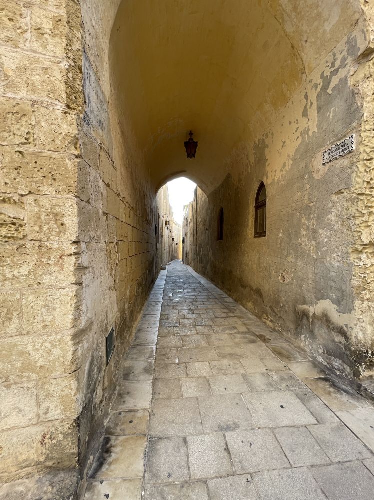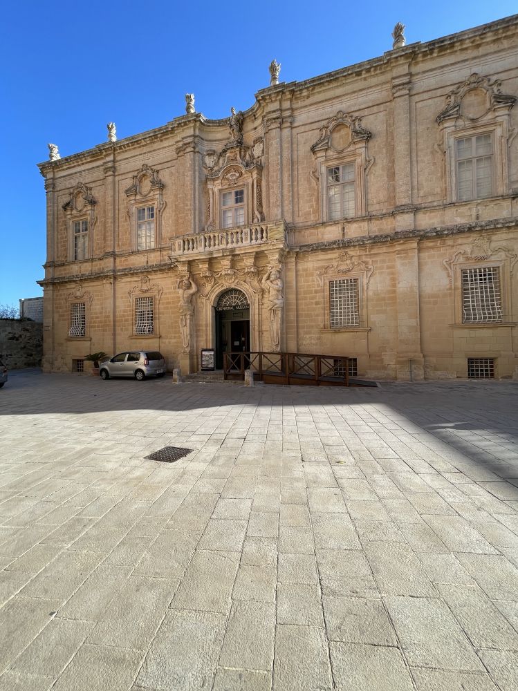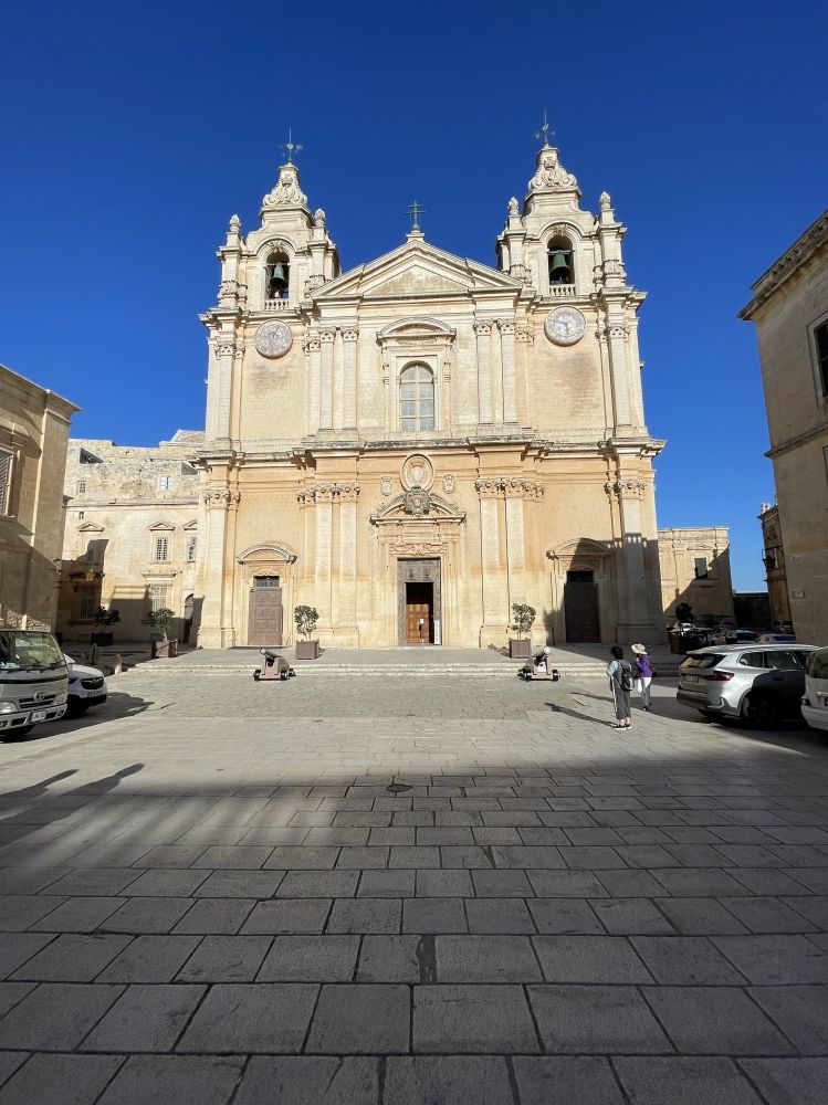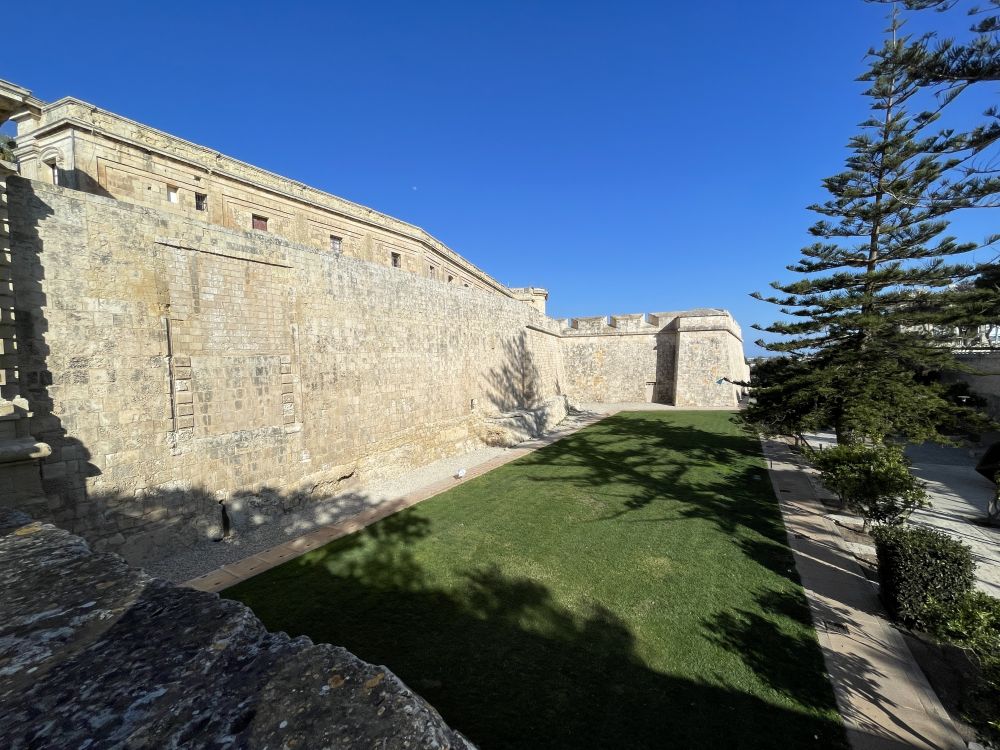 下午,乘公交车离开瓦莱塔,30分钟的车程外马耳他岛的中部是一座只有不到一平方公里的马耳他遗产城—爱廸纳(Edina)。姆迪纳有欧洲最美的城墙之誉(图59-61),而它特有的安静又被称为“沉默之城”。直到中世纪,这里都是马耳他的首府。十七世纪地震后重建,城墙完好,城中以教堂,修道院,旧贵族宅邸为多,且带典型的巴洛克精致豪华风格(图62-70)。城中建筑都用灰白的石料砌成,冷峻而干净,街道蜿蜒起伏,岔巷斜陌纵横,至少刚进入城里的外人是找不着北的。我们走出一饭店后往城外走,结果在小巷里转了一圈又回到那家饭店门口。可想而知当年是有意用这种方式来防御外敌侵入的。