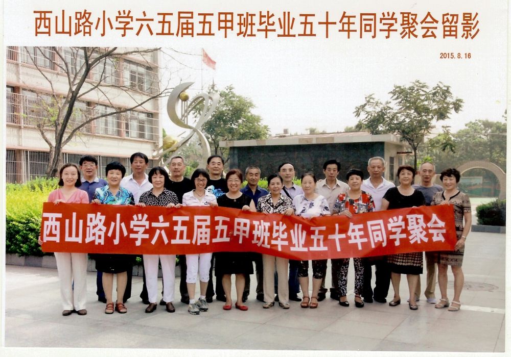 2015年8月16日,唐山西山路小学65届五甲班的同学们在毕业半个世纪后重聚在一起。首先,应感谢提出这一想法的华尔加同学及聚会的组织委员会成员:兰大奇,戴吾昕, 吴三对,黄世威,华尔加,杜静梅。 他们为聚会的实现做了大量工作。特别是我们的老班长杜静梅,为找到四,五十年没有联系的, 又经过地震搬迁的同学们,下了大功夫。
