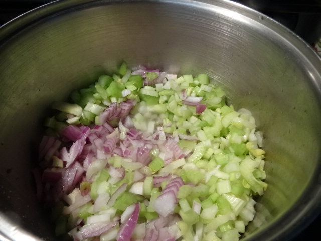 2.2 加入洋葱和芹菜,炒至洋葱透明,芹菜变软。