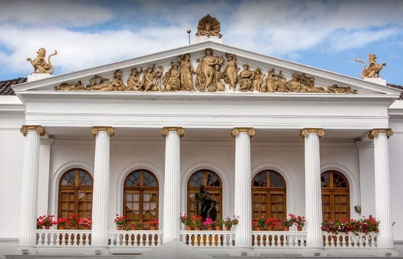 剧院前立面主体中间第二层为阳台。台前由六根愛奧尼柱式圓柱 (Ionic)撑起门廊。门廊中间是苏克雷元帅的雕像,这是西班牙艺术家何塞·冈萨雷斯·希门尼斯José González Jiménez的作品。