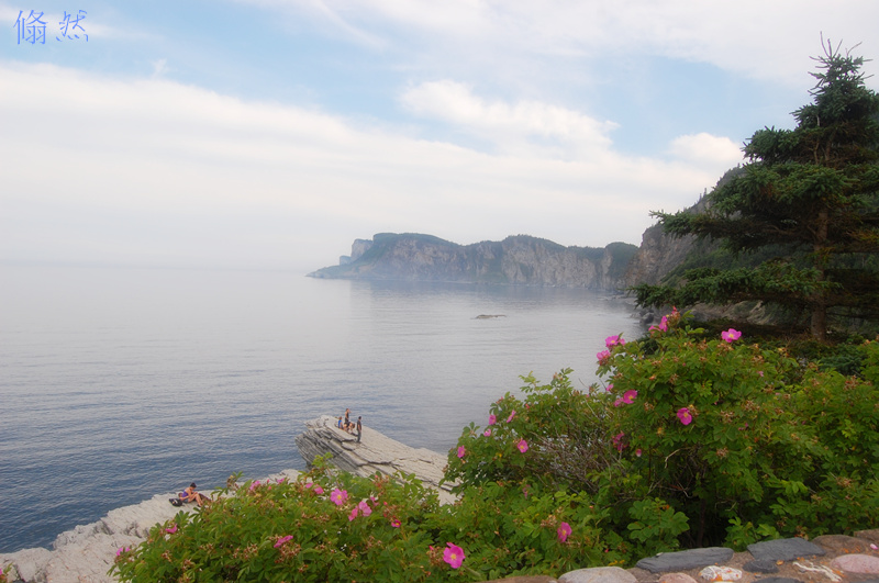 这个公园在Gaspe半岛的尽头, “颇有几分天涯海角的苍茫之美”。我们的营地在一个一室一厅的很Privacy的site。收拾停当,就开车到Cap-Bon-Ami。这处的景色不是那个大石头的震撼,而是一种山水交融的柔美,加上一个缓缓延伸到水里的岩石和岸上盛开的野玫瑰,真是一幅罕见的图画。