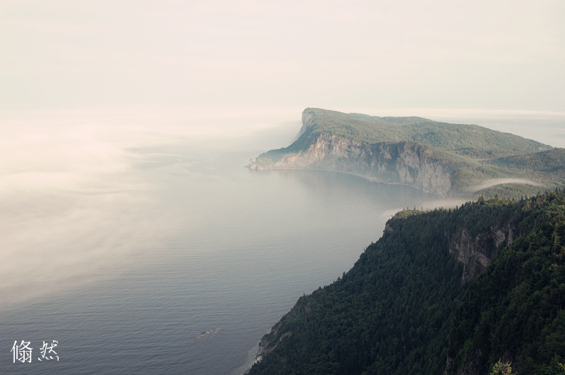 我们又沿着 Mont Saint-Alban Trail开始向山顶的艰苦攀登,这是个intermediate的trail,往返要两个多小时,老公和我的带有咸带鱼味道的鞋子还没干,只好穿着 crocs爬行,一路上欣赏各个lookout的同时,还每个人务色了一个hiking stick。气喘吁吁爬到300多米高的瞭望台,尽情体验天地间辽阔的壮美。我们在瞭望台上转了无数圈,一个方向可以看到远处Perce Rock 的倩影(见小儿的插图),