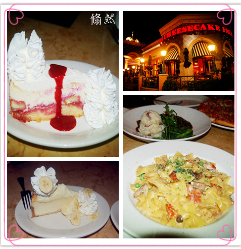 玩到将近关门,我们才出来,刚好肚子开始叫唤, 于是直奔Cheesecake Factory 去吃圣诞大餐。到那儿一看,队伍差点儿就排到了门外!我们本想换个地儿,但看到里面那一盘盘诱人的cheese cake,咽下口水,等!签了到,领了pager,就眼巴巴地盼着它叫。大约40分钟的样子,正当我们浑身瘫软,要砸pager之际,终于被幸福地领到了坐位上, 我又翻开我的秘笈,于是Pesto Chicken Pizza,Farfalle with Chicken and Roasted Garlic,牛排等纷纷上桌,我们风卷残云,就连餐前的两色面包都是那么美味!但最后的甜点才是精彩中的精彩:经典的cheese cake,我这回点的是Lemon Raspberry cream cheesecake和Fresh Banana Cream Cheesecake,真是人间极品!我们是拼了命也没吃完,打包回府!