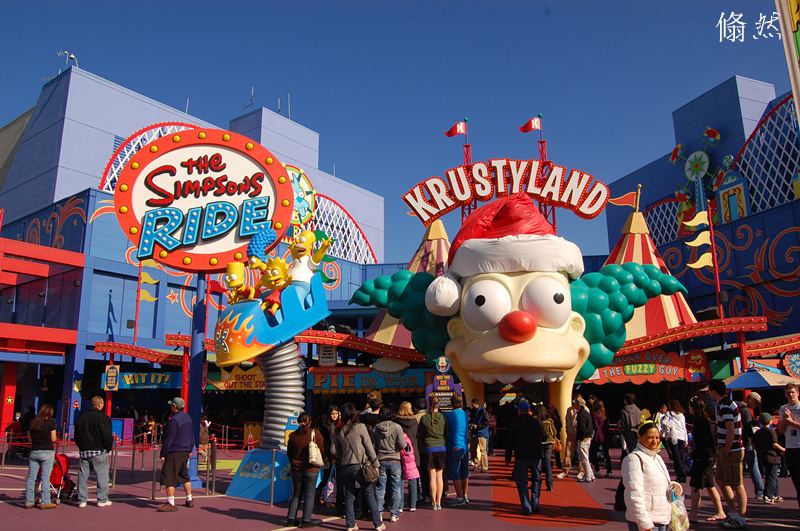 第二天,重游Universal Studio,以前去过奥兰多的Universal studio,但想着这里是好莱坞,那这个以电影题材为主的主题公园当然是这里的最正宗!一下车,眼前人山人海,比Legoland和海洋世界人都多,我们的期望值就更大了些!先去了最popular 的studio tour,看到原来绝望主妇里的一个个豪宅就是个又矮又小的小“玩具房”, 还有发大水的场景,等等......然后又是那些rides, 这里的ride我心里有底,因为我在奥兰多的时候就已经都坐了,侏罗纪公园很好玩儿,就是激流勇进了,前面都很平静,穿梭在侏罗纪公园的丛林中,时不时会突然冒出只恐龙朝你喷水外没啥考验心脏的,只有最后落下来的那一下是最刺激的!再有就是Revenge of Mummy,很恐怖,一句“You have been cursed”后车会突然加速,然后开始忽升忽降加急转弯,虽然没有翻滚,但一路上已经足够你一直憋着气不敢出了。一个骤停之后车开始向后坠,然后倒着重走来时路。我尖叫了一路,车停定后出一口长气的感觉真好,也为我的“勇敢”而骄傲,可孩儿们却表示下次坐ride坚决不能在我旁边……最值得一提的是这里有个刚刚建好的ride:The Simpsons Ride. 是我超级喜欢的项目。将室内过山车,跳楼机,漂流,3D电影等等高科技融合到一起,坐上车子和辛普森一家进行冒险之旅,人物超级可爱,惊险刺激但不吓人。