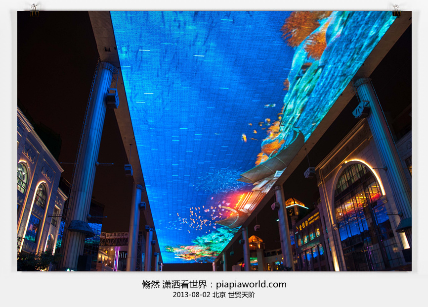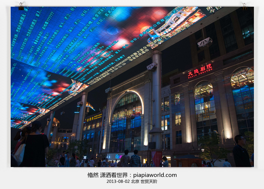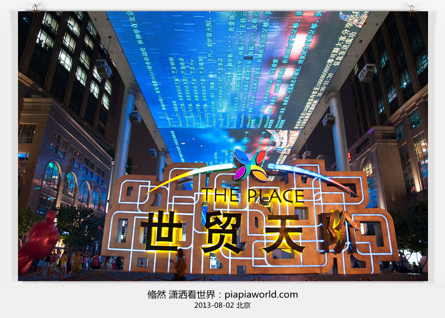 起来时已经下午4点多了,既来之则安之,这是在俺们天朝之都,不能就这么荒废时间,于是我们又来到附近的天坛,上次来这里回音壁是关着的,这回带孩 儿们看看,可是人家马上就关门了,扫兴!顺脚就到对面的红桥商业城逛了一圈,买了些无用的东西,在眉州小吃吃了晚饭。这时夜色快要降临,刚好到世贸天阶看天幕,总算一了心愿,北京的意外一天也算没浪费。