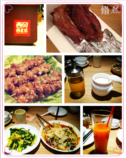 桌上有现炒的瓜子,我们边嗑瓜子边漫不经心地点菜。首先要品尝的就是这里的沙棘子饮料,是用新鲜的沙棘子现榨的,酸酸甜甜的很开胃。然后就是自制的原味酸奶,加上一大勺蜂蜜让人欲罢不能。接下来当然是朝思暮想的羊肉串,羊肉棒,配上爽口清凉的黄瓜凉粉和西瓜汁,小儿更 是奋勇地又来了一大碗莜面窝窝。我们吃得满嘴流油,浑身羊膻,晃晃悠悠地沿着南京路逛回来,一边消化羊肉,一边欣赏最后的上海滩夜景。