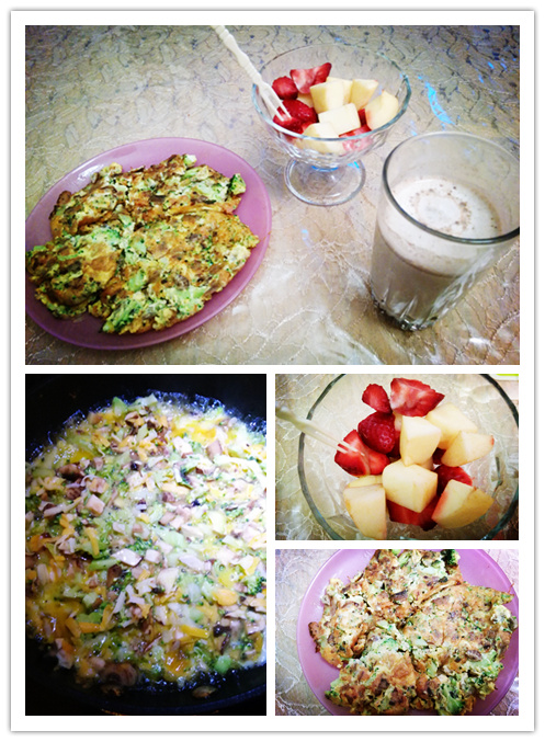 爱心早餐系列第十二款—西兰花蘑菇omelet,巧克力热奶,和水果