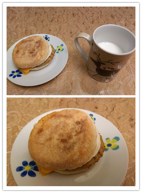 爱心早餐系列第十三款—English muffin with egg, cheese and sausage和牛奶