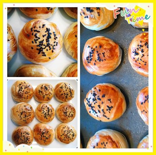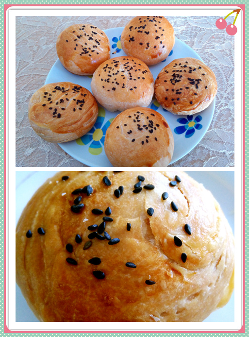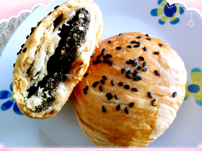 后来老公的北方情节作怪,不感恩地嘟嘟哝哝:酥饼还是甜的好吃。那就动手吧!这回刚好俺眼睛在大修中,老公只好亲自上阵,按配方和面,俺这边视线模糊地大 概其地调制黑芝麻核桃馅料(黑芝麻粉,核桃碎,糖,黄油,粘米粉),擀皮的步骤也大大地省略,水皮和油皮都分成四大份,千层酥皮擀好后再分成六小份包馅。 这次擅于包包子拿褶的老公不允许俺在那乱揪乱捏,拿出包包子的神功居然都包得大小适中,体态圆满,俺在一边刷蛋黄,撒芝麻,做些美容升华的琐事,不一会 儿,二十几个香甜酥松的黑芝麻酥饼就出炉了!这酥饼咬一口,酥皮落一地,甜香溢满口,幸福冲昏头!