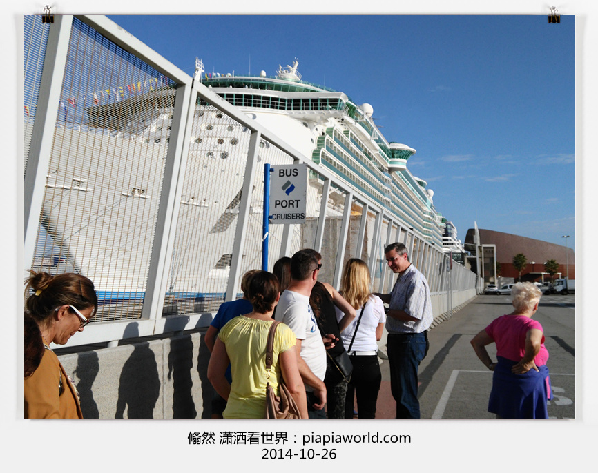 早上7点就被闹表闹起,老公又没睡好。我们从容地吃了早餐9点多就下船了。这天的巴塞罗那气候宜人,不冷不热,T恤即可。码头上人头攒动,各种 shuttle bus来来往往,运载着从各个船上下来的欢天喜地的游人。我们的兴致也提到了极高,在码头坐上blue shuttle,在车上居然也学着旁边一伙高丽人玩起了自拍。
