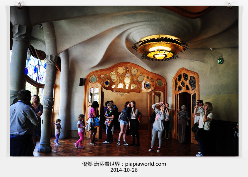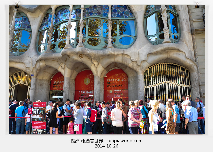 从哥伦布广场再坐地铁到Gracia,我们买了10欧10张的地铁票,估计刚好够我俩一天的交通。一出地铁站就是巴特罗公寓(Casa Batllo)。此时门口已经排了长长的队,这也是预料之中的,所以毫无怨言地排了起来,大家边排队,边蹭网,我更是很快地给孩儿们留了言,也看到了小女 的报平安,所以格外轻松。