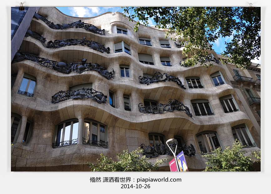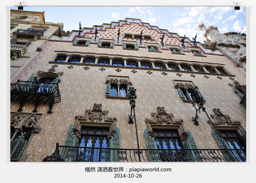 冲了电之后我们又地铁回到Garcia 街,这回开始慢下脚步欣赏这个不和谐街……格拉西亚大街(Pg. Gracia)从Gran Via大道到Diagonal之间的一段,别名“不和谐街区”(Mancana de la Discordia)。 因为在这短短的一段路上,汇集了三位设计大师设计的三座风格迥异的建筑,即梦幻的巴特罗之家、端庄的阿马特耶之家和柔美的叶奥·莫雷拉之家。这三座建筑比 邻而居,巨大的反差带给人强烈的视觉冲击。就连这条路上的街灯,都是风格华丽的铁艺作品,使得整条大街充满了艺术气息。—来自网络