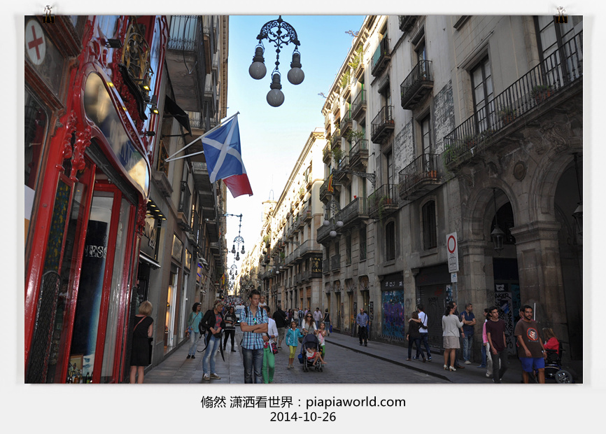 又坐地铁回加泰罗尼亚广场(Plaça Catalunya) ,这个有好多鸽子的广场位于整个巴塞罗那市中心的位置,连接着老城区和扩建区。它成四方形,四个角上延伸出四条大街,其中的两条就是巴塞罗那主要的大街兰 布拉大街和格拉西亚大街了,我们信步走到Rambala大街,随着汹涌的人流开始往码头方向慢慢走,一路欣赏着路边的各式建筑,一边琢磨着到哪里再去吃点 心。