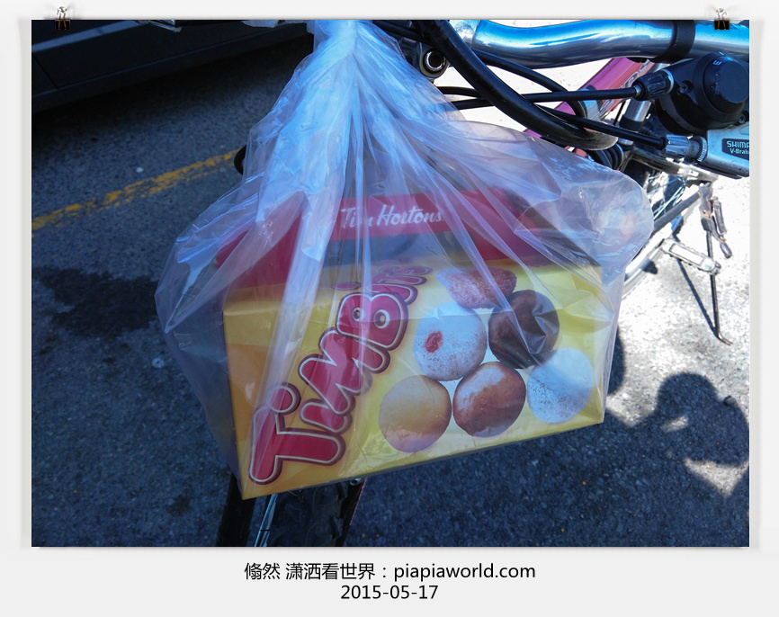 骑着骑着,感觉有些饿了,我提议一口气骑到大统华,然后油条豆浆的吃上一顿标准的小康早餐,但老公说我不能凭着一股猛劲骑太远,担心我累坏了回家会磨人,所以只好就近到Tim Horton来顿标准洋早餐打发了肚子,离开之际又有些于心不忍,就又顺手给孩儿们的早餐打包回来。
