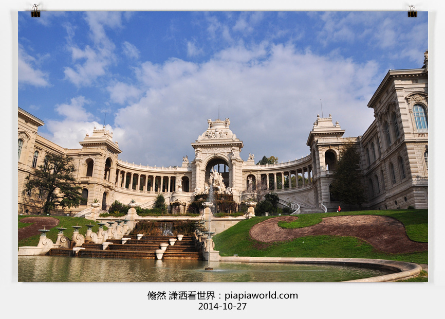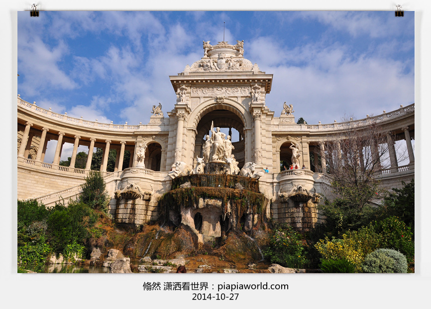 Longchamp palace(Le Palais Longchamp,隆尚宫),是一座弧形的建筑,集巴洛克、罗马及东方风格为一体,十分宏伟。它的中央是以“水之赞歌”为主题的群雕和喷泉,两边各延伸 出去一段回廊,回廊的尽头各有一座博物馆,分别是美术博物馆和自然历史博物馆。从宫门进去,后面是一个动植物公园及天文馆。—来自网络。不知为什么这里没 有什么人参观,静悄悄的……