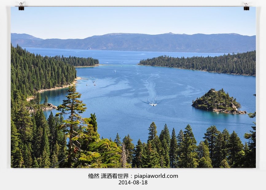 早上九点多出发,今天的任务是环湖来一圈。先到Emerald bay,经过昨天那段天路的时候,我紧闭双眼,两手冒汗,横下一颗视死如归的心,艰难渡过。到人丁兴旺之处一看,原来昨天去的是Inspiring point,今天这里才是真正的state park,好不容易在路边找个停车位,顺着trail下到beach,昨天在山顶瞭望的翡翠小岛,现在就在眼前,虽然被游人吵得有些熙熙攘攘,少了那种世 外桃源般的神秘感,但也还是酷暑中难得的一丝清凉,碧湖中一道靓丽的风景。