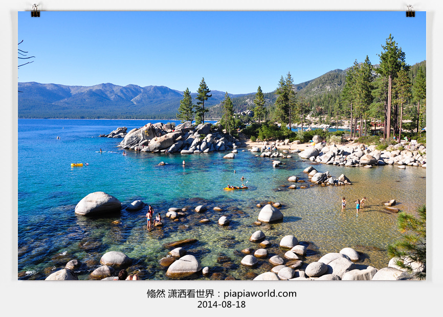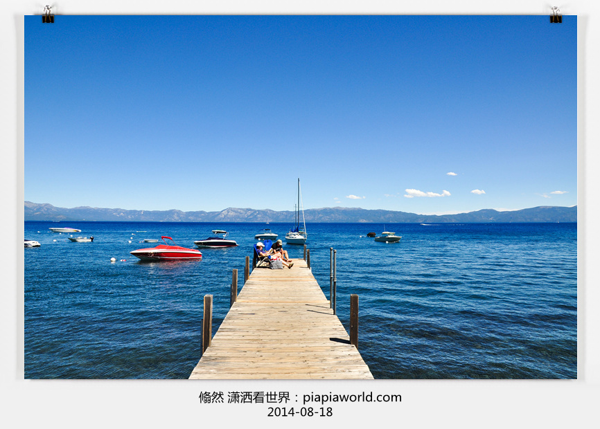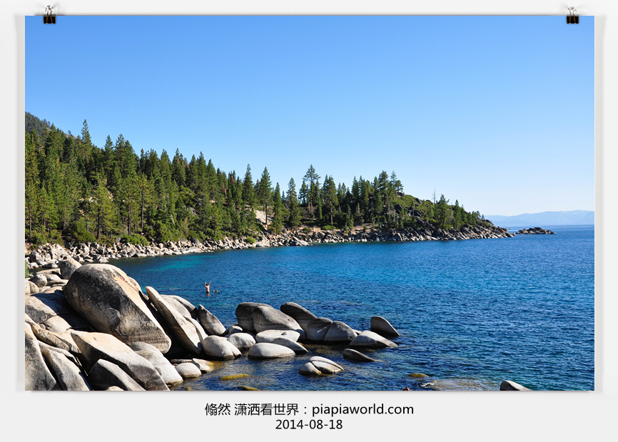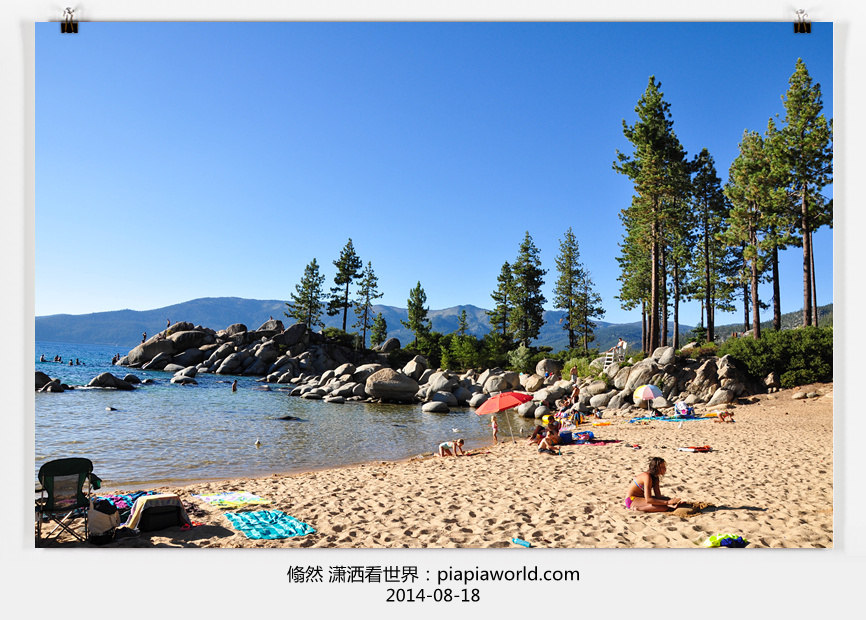 后来在Tahoe city找到了一个beach,岸边荫凉处刚好有野餐桌,于是我们在那里舒服地享用了我们的Santa fa色拉,水果和零食,孩儿们在水边skip stone,我们在荫凉处休息,观看。