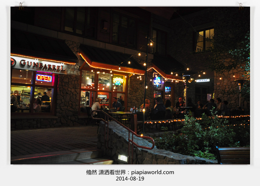 晚上,我们吃完饭就散步到Heavenly Village,按小女的要求到一些cool shops去逛逛,夜幕下的小村镇,游人如织,酒吧,音乐,篝火,交辉相映,很热闹。