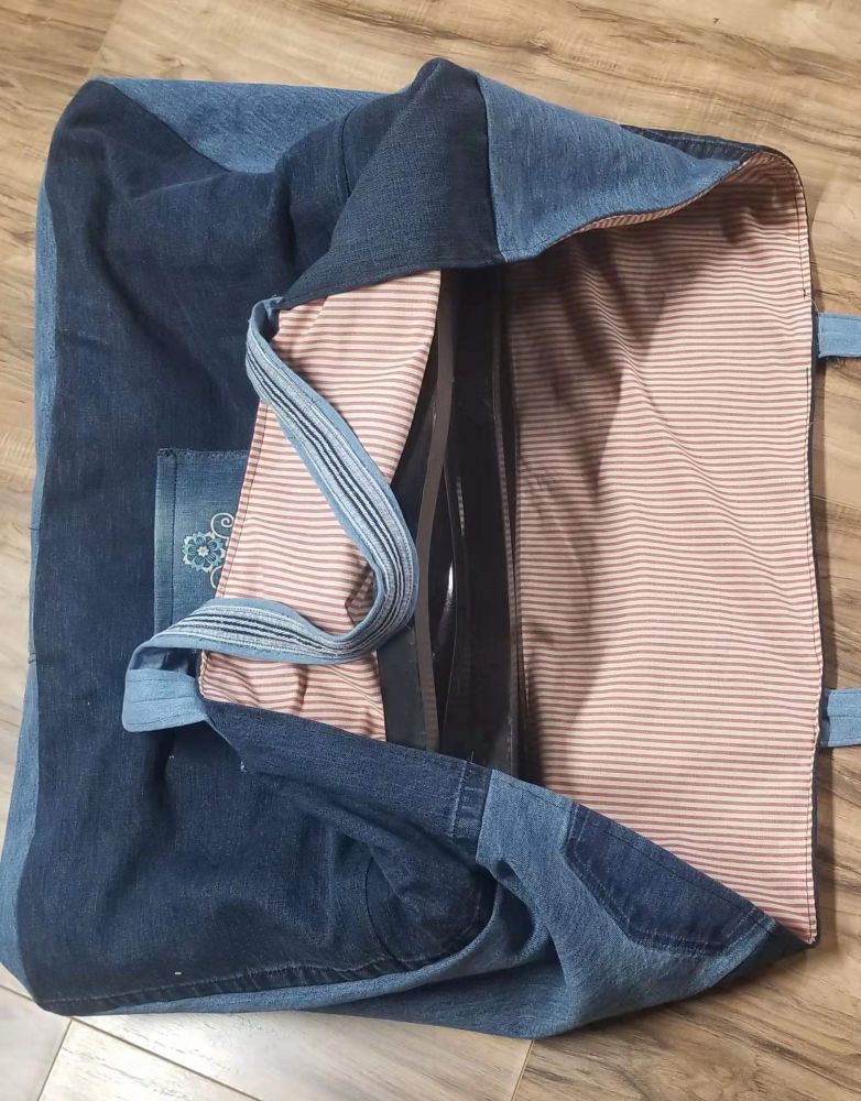 一条宽腿牛仔裤,一条小女孩的牛仔裤,只用了裤腿的两个图案, 一条带装饰条的牛仔裤,剪完后: