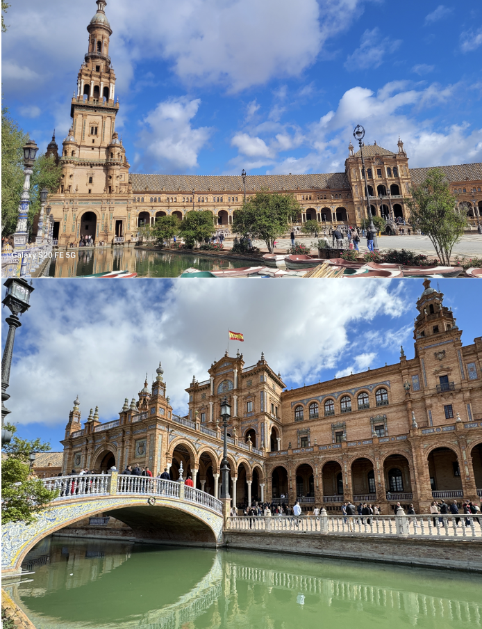 今天的计划去皇宫。早上我们先坐公交车去了河边, 河边有个海盗船。不是游乐场里的海盗船,就是一艘看起来和海盗开的船一样的船。开启游客常规活动拍照,打卡。然后顺着人群往左手边走,就到了著名的西班牙广场。 西班牙广场很大, 很气派。整体是一个弧形的建筑, 弧形建筑的中间就是一个大广场。广场前面有一道环形的小湖,四周有不少拱桥横卧其上。有人在划小船,有点像拉斯维加斯的小小运河。