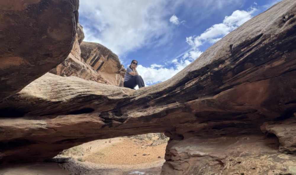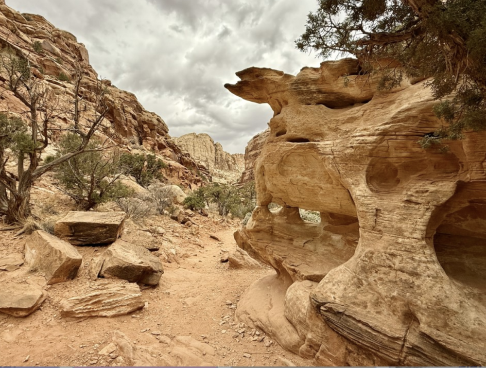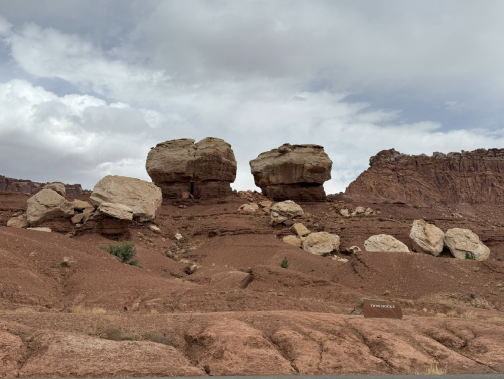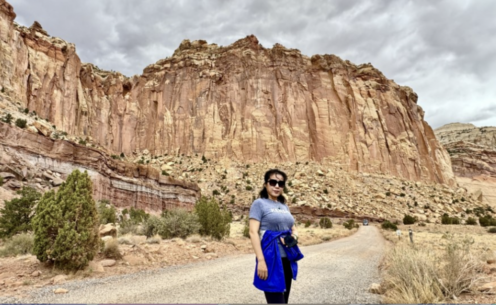 游客中心的工作人员很热情的给我们出示地图,然后推荐来观赏的路线。我们先去看了Capitol Reef,就是公园的地标性的那座大山。远远看去像是国会山的白色圆顶。可是我看起来更像是一个奶油冰淇淋球。