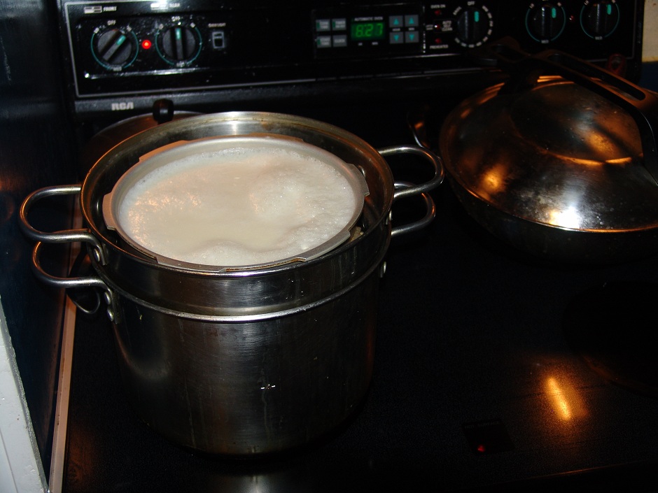 4.汇集全部豆浆,上锅隔水煮。豆浆沸腾5分钟关火。