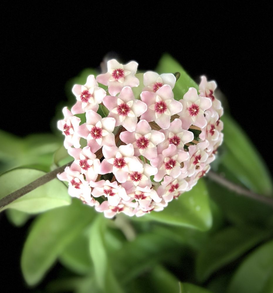 那是何等的惊喜!球兰的花苞像一串小铃铛,娇嫩而有质感。当紧包的花瓣打开的瞬间,一股清香喷涌而出,沁入心扉;更惊艳的是球兰花的美丽,那蜡质般的五角星花朵,每一朵都有不同颜色的3 个层次,众多兄弟姐妹们紧紧团结在一起,整齐地聚集成球形,花朵精致的程度令人称叹,不得不赞叹造物主的神奇。