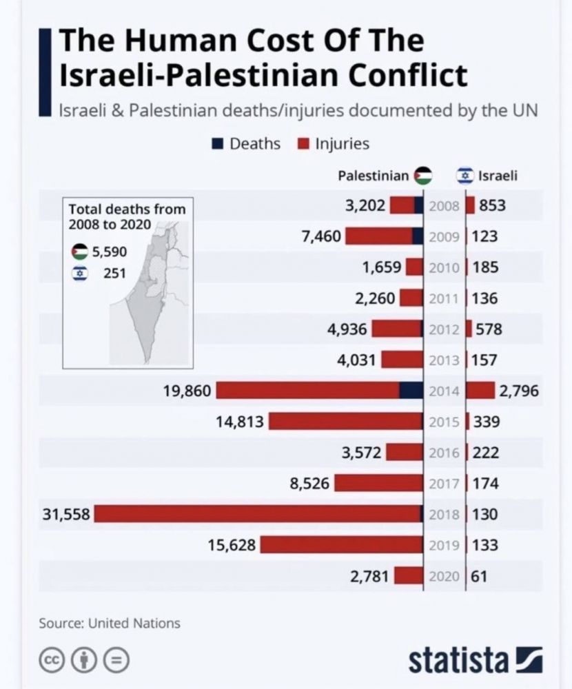 再看看以色列和哈马斯间的战争,或者说是以色列和阿拉伯世界的战争。历史上的前几次中东战争,以色列都依靠先进的武器取得了胜利。而且和对方的伤亡比相差很大。这样的战果一直被奉为神话般的战绩。看看下面据说来自联合国的数据。