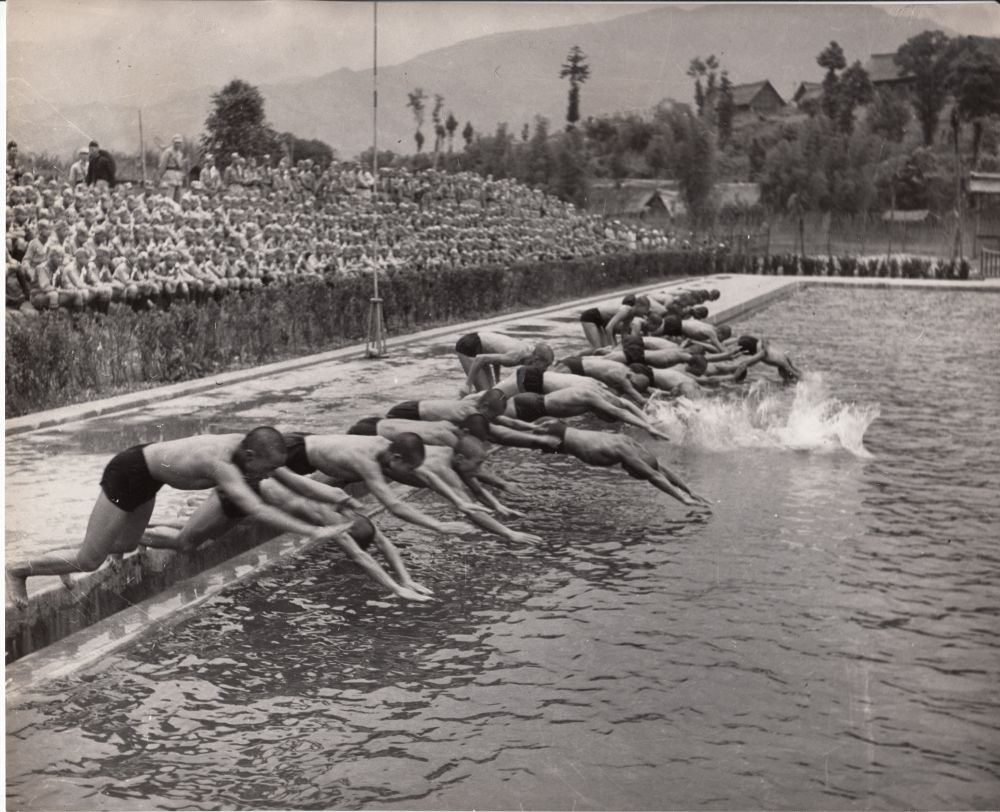 值得一提的是,空军幼年学校的游泳池还是川西最早的游泳池。池水由蒲阳河水灌入,空幼人在蒲阳场口的蒲阳河上修筑了一个分水坝(小堰头),采用地方旧式水车加以改良,使水由蒲阳河灌入滤水池,滤净后再放入游泳池。池边有高跳板、低跳板、更衣室,还有看台。