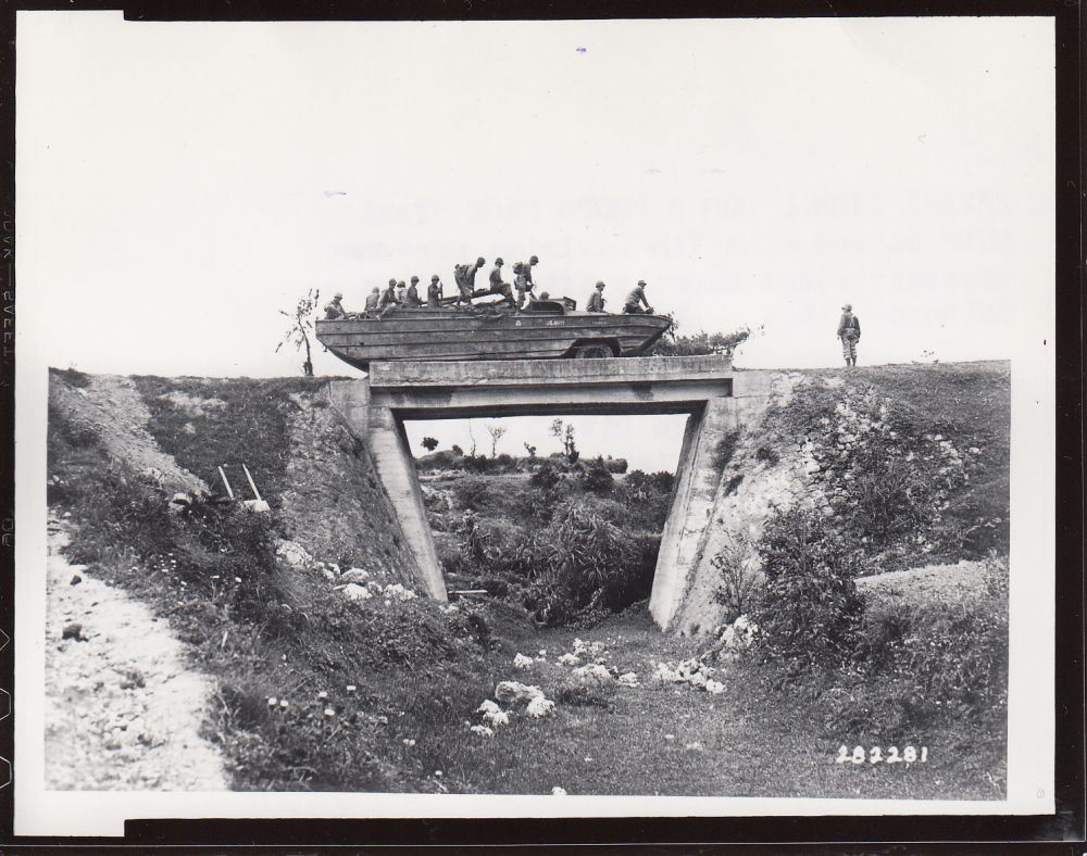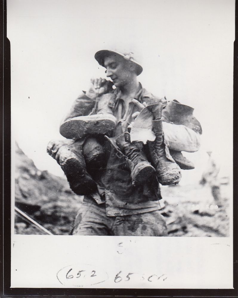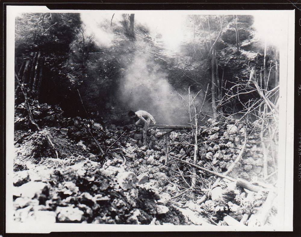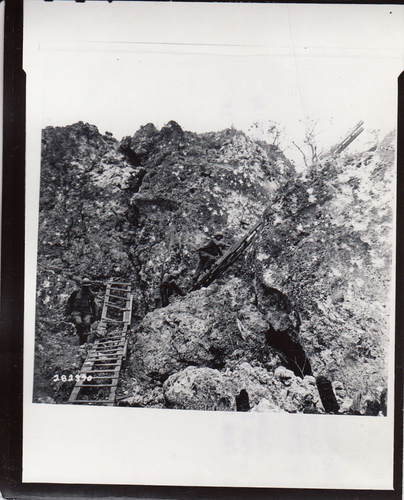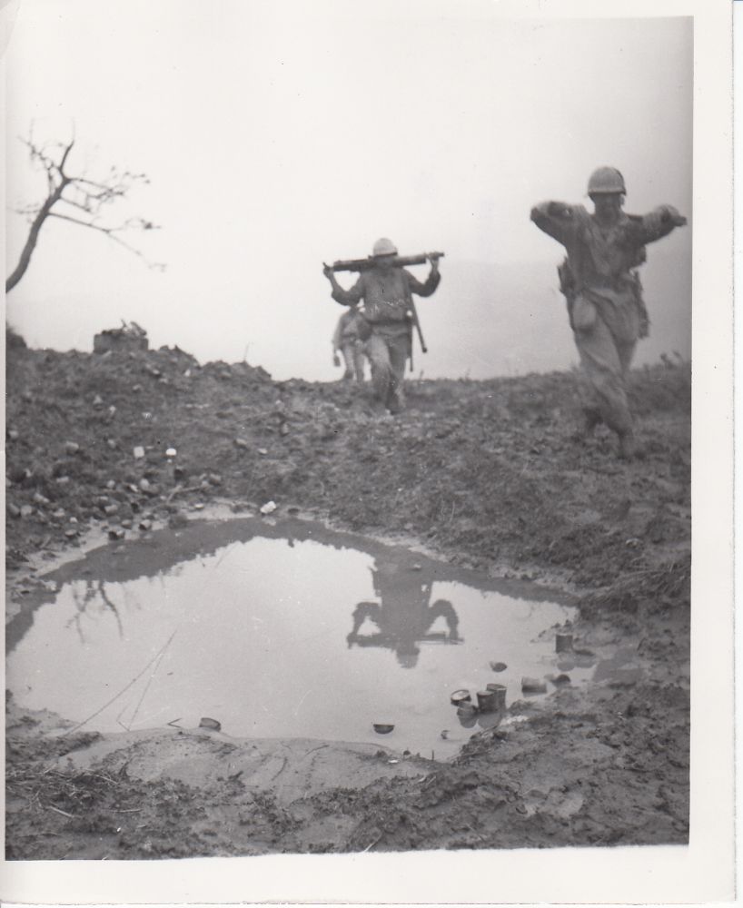 美军士兵行军途中经过首里附近的一个炮弹坑