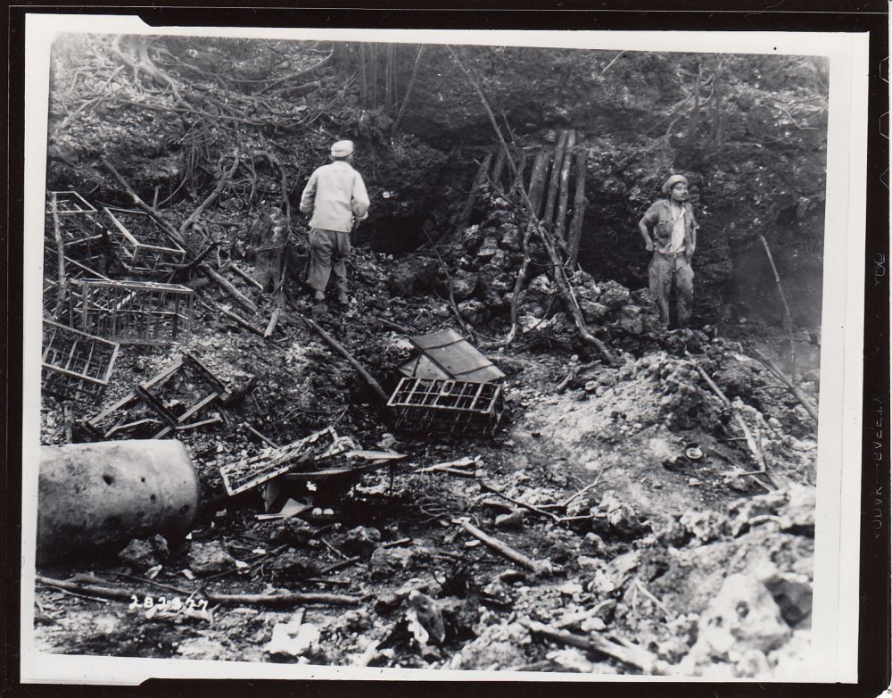 一位男人打扮的冲绳妇女从刚刚被攻击的洞穴里走出来