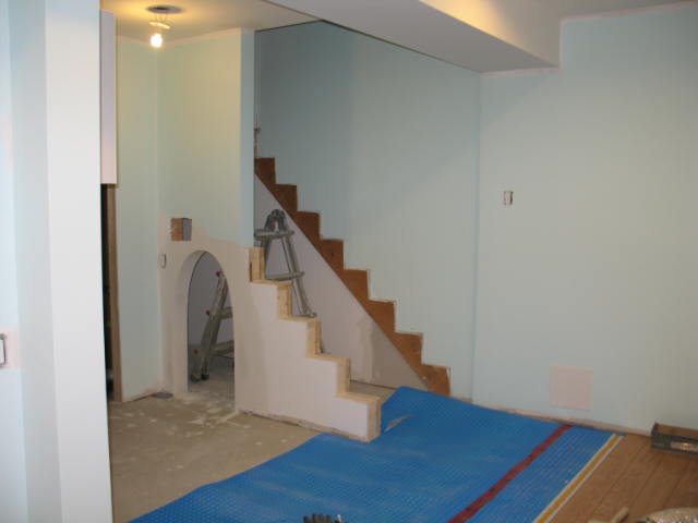 该空间占地3x8尺,合约刚过2平方米。地板与门外接通,选择仿橡木复合地板,墙体上离地3尺是实木装饰扣板,之后的实木腰线将扣板与三色套色粉刷葛然分开。三种颜色分别来自于代表早晨太阳的黄(2018-50)以及代表天空的蓝色及大部分女孩喜欢的紫色(2071-50)。平顶的天花部分装了?一盏筒灯,墙上预留了?一个电源插座,为孩子将来摆放迷你电器之用。(特别提醒:这个插座上?一定要有绝缘保护,而且插放电器的工作一定要由家长亲自完成!)。