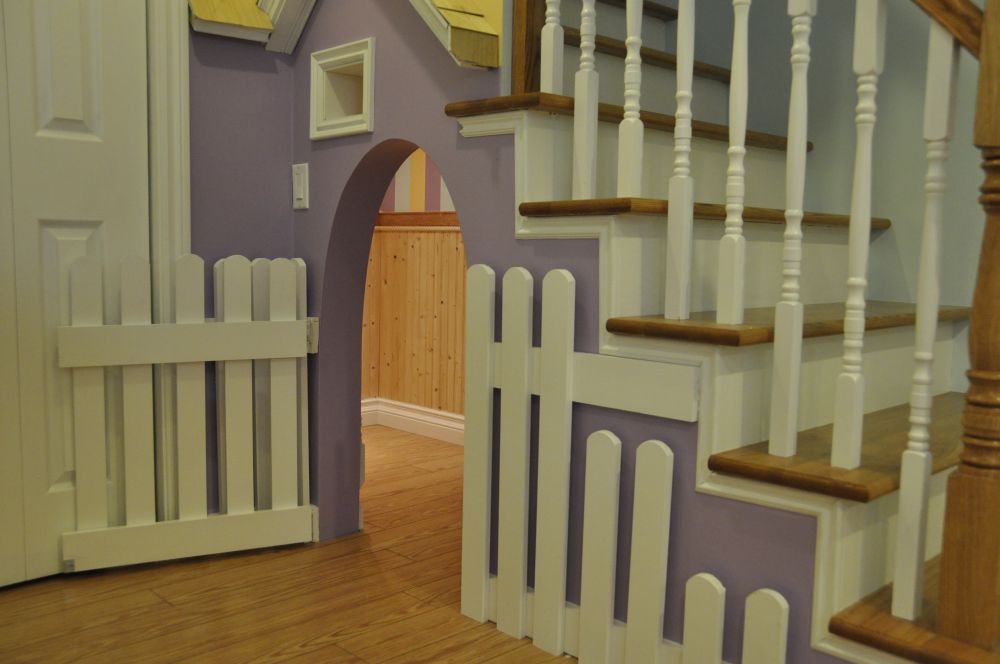 楼梯,从结构上讲是一个斜搭在两个平面之间的斜面,从侧面看,她就是平卧在地上的一个直角三角形的斜边。楼梯下面的空间就是这个三角形的面积乘以楼梯的宽度。这个不小的空间里是可以搞出一点“彩”的。最常见的形式是储物,比如依梯而建的异型书架等。也有将热水器放在这里的。本案例是将这个空间做成小朋友的“小家家”。