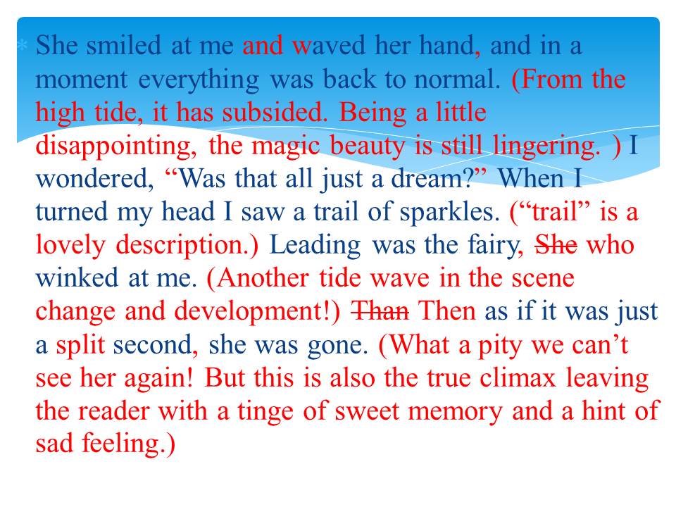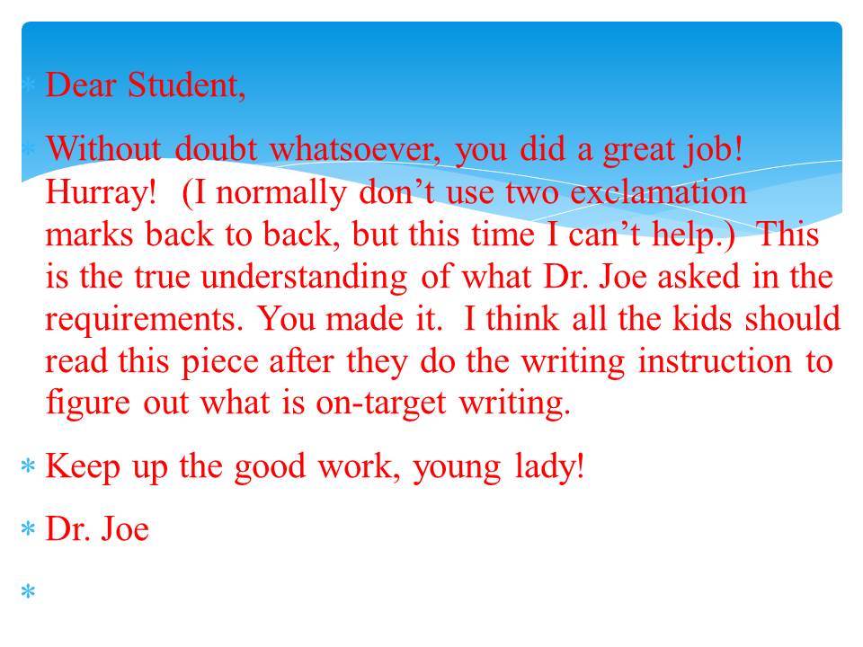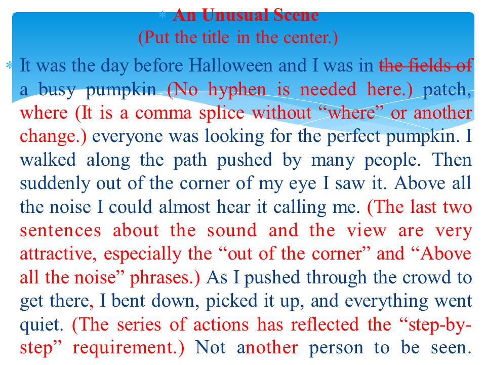 大家还记得今年2月12日我在小教天地发的帖子吗?说的是我Local的写作班有一对姐妹,妹妹是六年级,姐姐是高中生。妹妹当初不愿意学,特别是当老师布置写作文的时候,骄傲的妹妹不知如何下手写,经过半年的学习,写的像模像样了!今天上午这两个女孩的妈妈给我打了2次电话,并给我留言,告诉我喜讯,说这个妹妹在全市写作比赛中获奖了,奖品估计会是一个IPOD。稍后我把这个妹妹得奖的文章后也贴在这儿跟大家分享,这是我2月12日发的这个妹妹的文章以及Dr.Joe批改过的文章及评语: