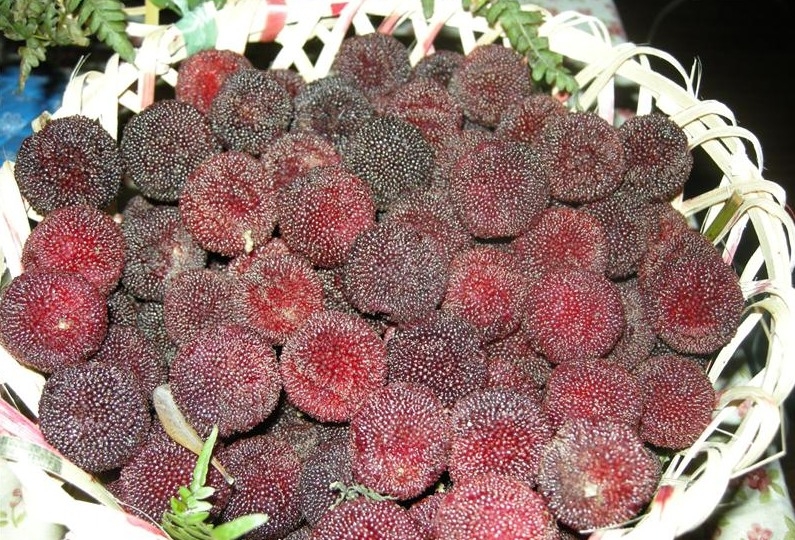 乌紫杨梅 东山产杨梅已有一千多年历史,今为江苏省杨梅重点产区。明代東山人王鏊《姑苏志》载“杨梅为吴中佳品,味不减闽之荔枝。”清代《花镜》也称杨梅为“吴越佳果”。杨梅为常绿乔木,树干高达10米以上,是一种美丽的观赏树木。每年农历三月开花,黄白相间的小花,常在夜间开放,天明凋谢。杨梅果五月成熟,“夏至杨梅满山红”,为东山增添色彩。东山杨梅品种繁多,仅以色分就有紫、红、白三种,其中紫色最好,白色次之。内有一种乌紫杨梅果型大,肉肥汁多,味甜核小,刺圆如珠,因成熟后果色乌紫而得其名。鲜食时,甜如蜜,鲜洁可口,开胃生津,为东山诸杨梅之精品。乌紫杨梅一般鲜食最佳,最好从树上采摘时就吃,味更佳。我数次去東山看乡亲们採摘杨梅,我也边採边吃,乡亲们总劝我连杨梅核一起呑下,他们认为杨梅核可清除肠胃殘渣。除鲜食外,还可酿酒或制成上等杨梅果汁、果脯。加工后的白糖杨梅干远销海内外。