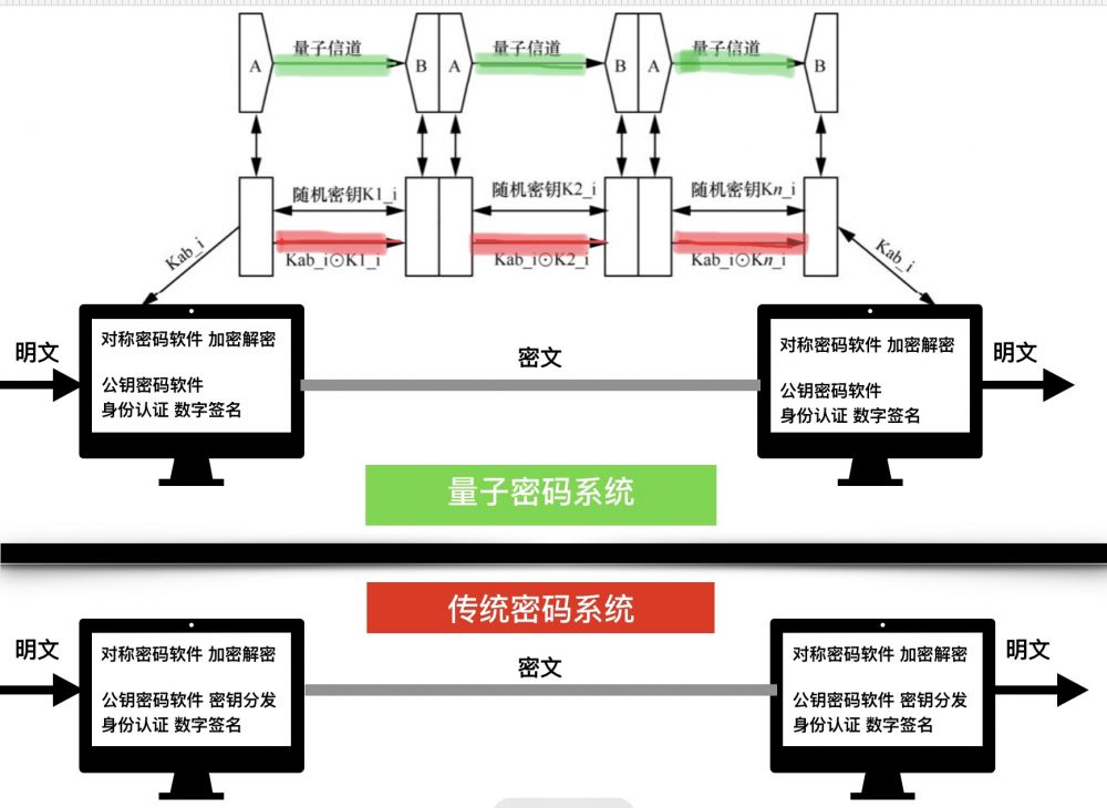 量子通信不是一种新的通信技术,目前己建和在建的量子通信工程其实都是用量子物理手段分发密钥(QKD)的一套硬件设施,它只是密码系统中的一个小小的子功能。一个使用QKD的完整的密码系统,加密解密还得使用对称密码,身份认证和数字签名只能依靠公钥密码,因此《量子密码系统》其实就是《传统密码系统》再加上整套繁复的QKD的硬件设施(见图二的上半部)。