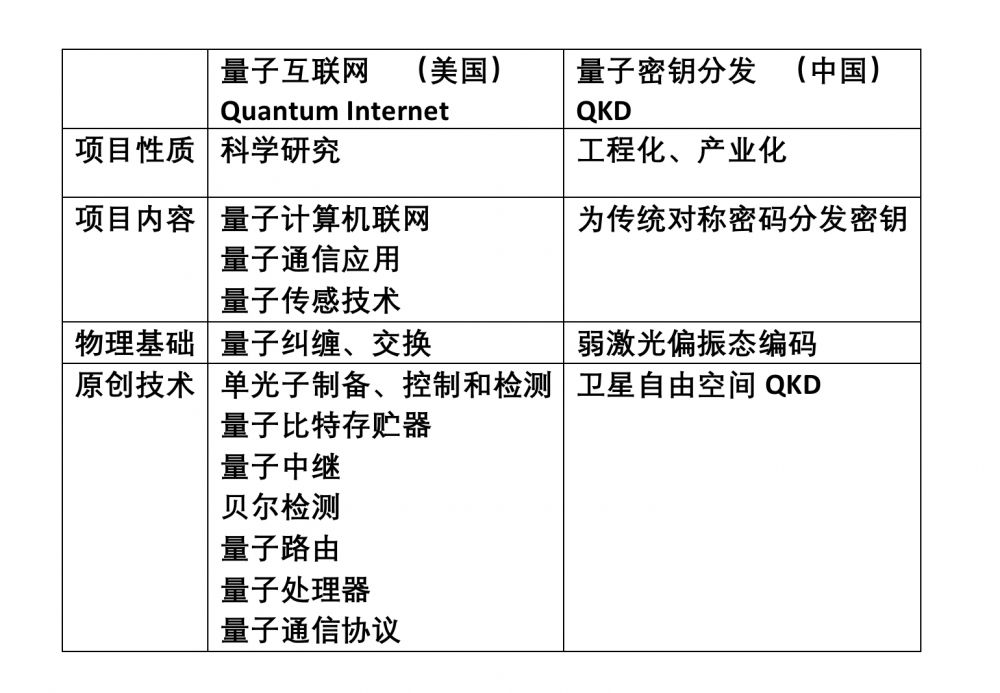 从这份被称为“美国量子互联网发展的战略蓝图”的报告中可以清楚看出,美国将立足于“量子互联网”,主要从事科学研究。而中国倾力于“量子密钥分发技术”(QKD),专注于工程化、产业化。两者基本上是各做各的,根本不处在同一层次上,就像苹果与桔子,没有什么可比性。详见表一。