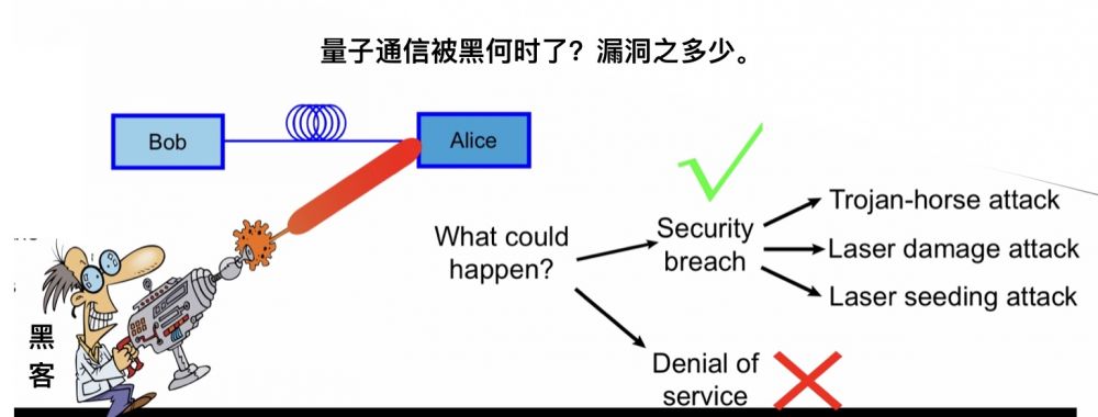 图片说明:黑客对量子通信(QKD)的发射源端(Alice)的攻击可以分成两个方面:利用安全漏洞(Security Breach)和阻断服务攻击(Deny Of Service)。利用安全漏洞又可细分为三类:1)特洛伊木马攻击;2)激光致盲攻击;3)激光注入攻击。