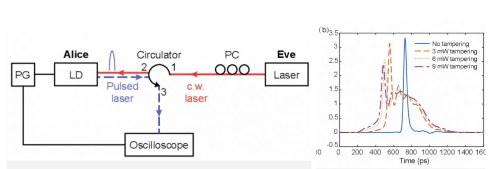 实验装置见下图左。黑客(Eve)使用可调激光器(C.W.)通过单模光纤将激光注入QKD的发射光源(LD)。通过调节激光的波长,将适当波长的光子注入激光二极管(LD),当注入的光子的能量与激光器的激发态和基态之间的能级差相匹配时,导致受激发射。为了最大程度地提高注入效率,黑客使用偏振控制器(PC)调整注入激光的偏振,使其与QKD的偏振状态相匹配。为了将注入激光与QKD的信号分开,实验使用了光学环形器(Circulator)。攻击的激光进入环形器的端口1,然后由端口2输出(红线),而QKD的信号从环形器的端口2进入由端口3输出(兰色虚线),最后送入高速脉冲同步示波器作观察和纪录。